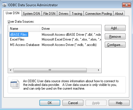 If you use 64-bit OS and do not see this shortcut, go to C:\Windows\SysWOW64\ and run the odbcad32.exe file. The ODBC Data Source Administrator window appears (see figure below).