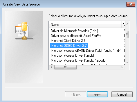 3. Click the Add button and choose the Micronet ODBC Drive 2.7 from the list (see figure below). The driver should be installed beforehand.