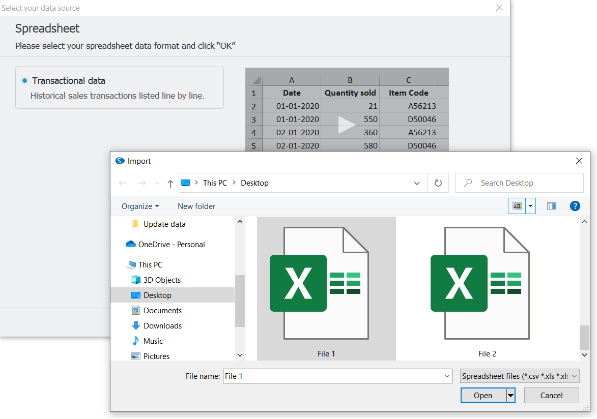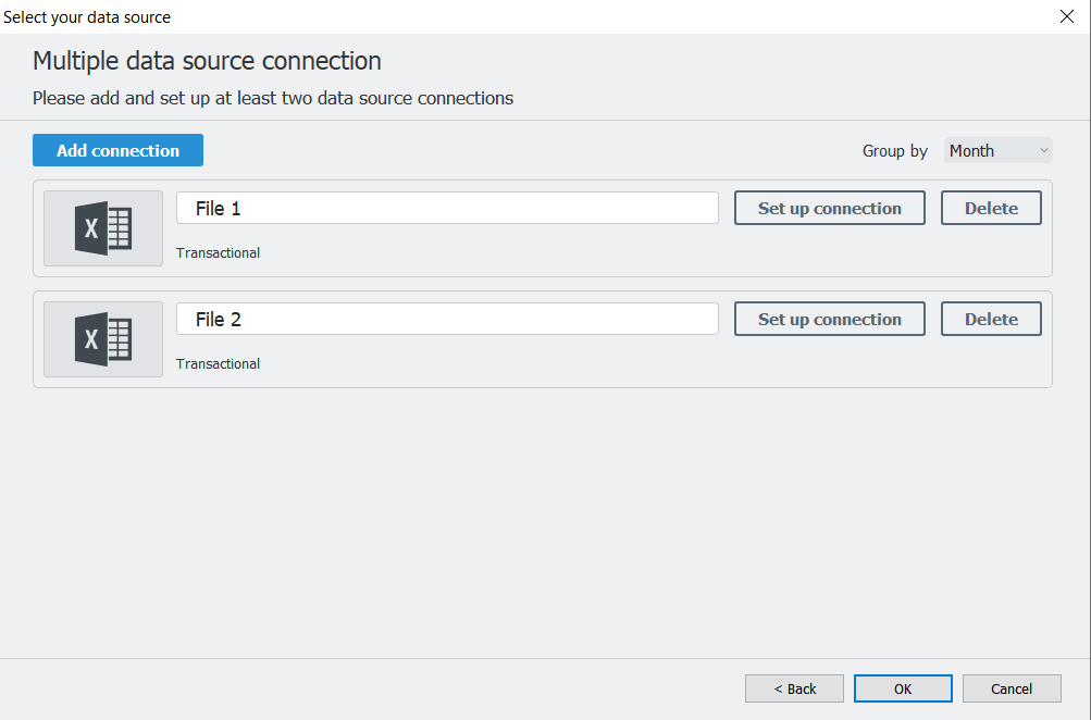 2. Click Add a connection to choose the first data source. In our case, it’s Spreadsheet. The only option that will be given is Transactional data. Click OK and find the file for the import.