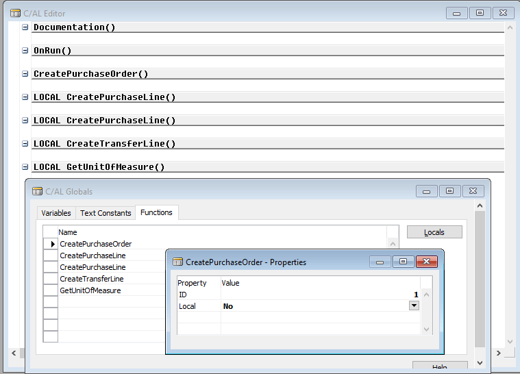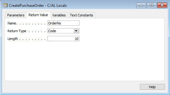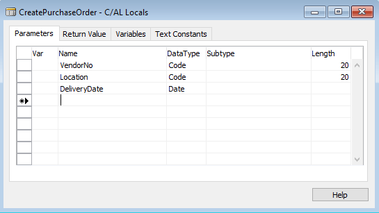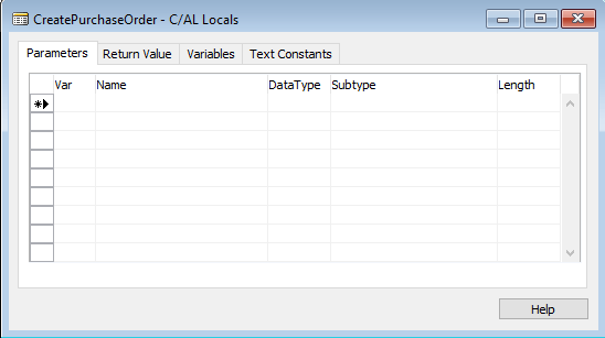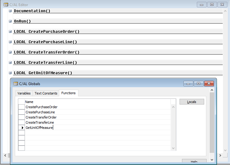3. Set the cursor on the line with the CreatePurchaseOrder function, and click on the Locals button found on the right of the C/AL Globals window. The C/AL Locals window appears (see figure below).