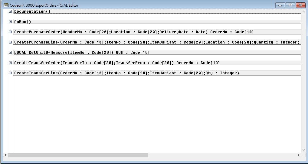 Codeunit is a container for a programmer's code written in special NAV language called C/AL. In our case, a codeunit will contain five functions:
