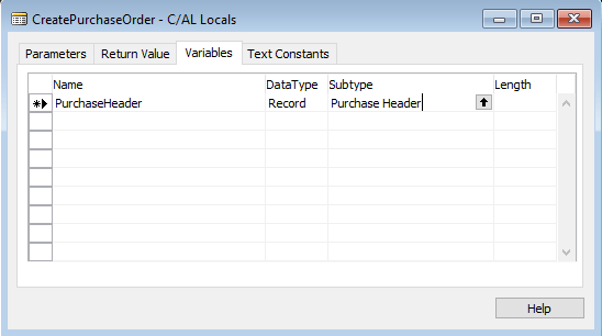 In the body of the function, we will use a local variable that is linked to the record of the NAV PurchaseHeader table. To declare this variable: