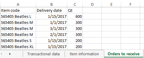 As you see, Orders-to-receive information is imported here through the Qty to receive and Delivery date data types.