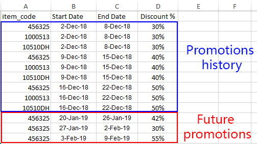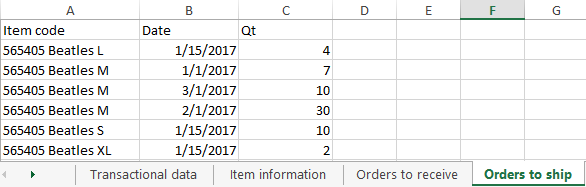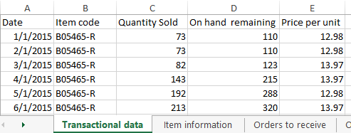 You can download an example of the data formatted in Excel file with merged Transactional data and Item information.