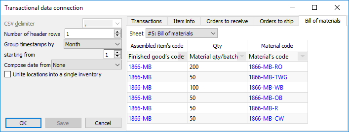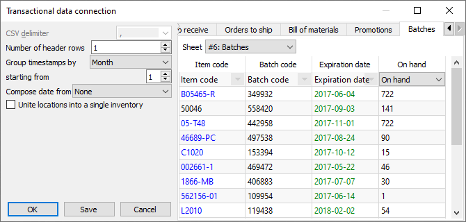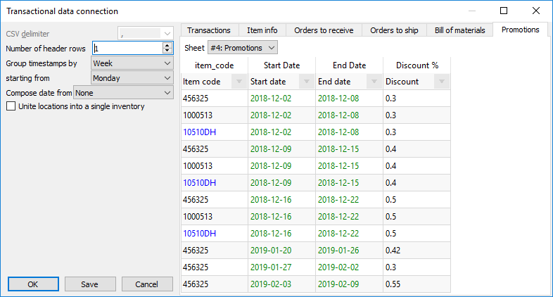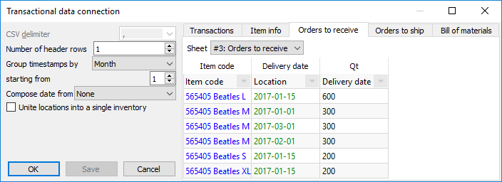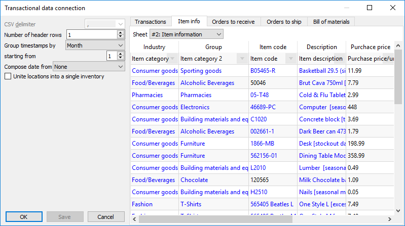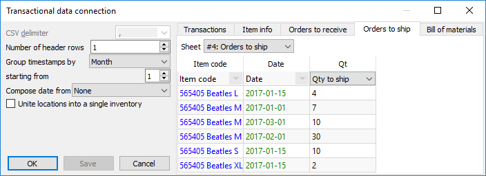 Excel files allow importing almost all of the data types. Each of the data pieces should be on a separate sheet of the Excel document. The first sheet must contain Transactional data. Below, we show the format for each piece of data in an Excel file. The sequences of the data type columns and spreadsheets in the file can be arbitrary.