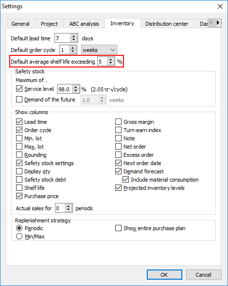 Streamline automatically notifies you when the Current order qty is reduced due to the given Shelf life limitation. All your inventory information is on the Inventory planning tab. By default, the shelf-life-related parameters are hidden. To show them: