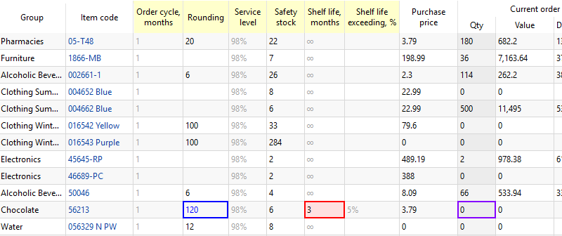 A red background for the cells in the Shelf life column of the table (see figure below) indicates that the calculated Current order qty has exceeded the shelf life limit qty. Streamline cuts this quantity down based on the shelf life limit qty in order to satisfy the given Shelf life exceeding percentage. Then, this limited amount is shown in the Qty column of the Current order section. In the example shown in the figure, it was cut to 0.
