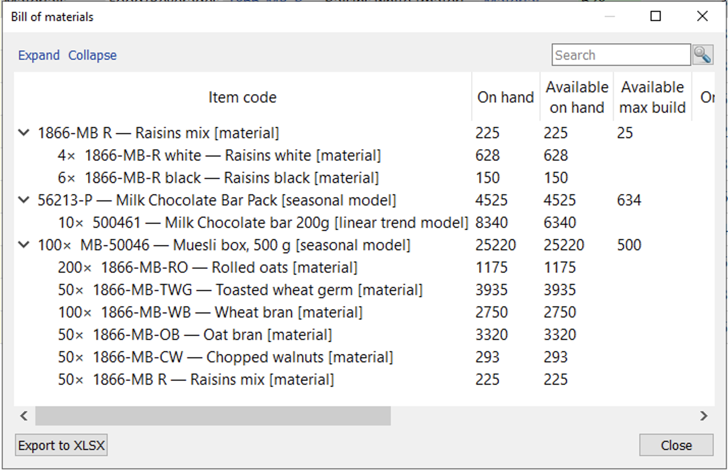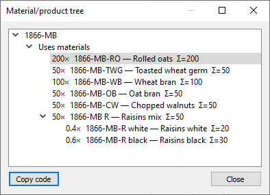 • the sum symbol at the end of each tree node shows the quantity of this item required to build the given number of the finished item. In our example, to create 1 unit of 1866-MB we need 20 units of 1866-MB-R white, which is 50 * 0.4.