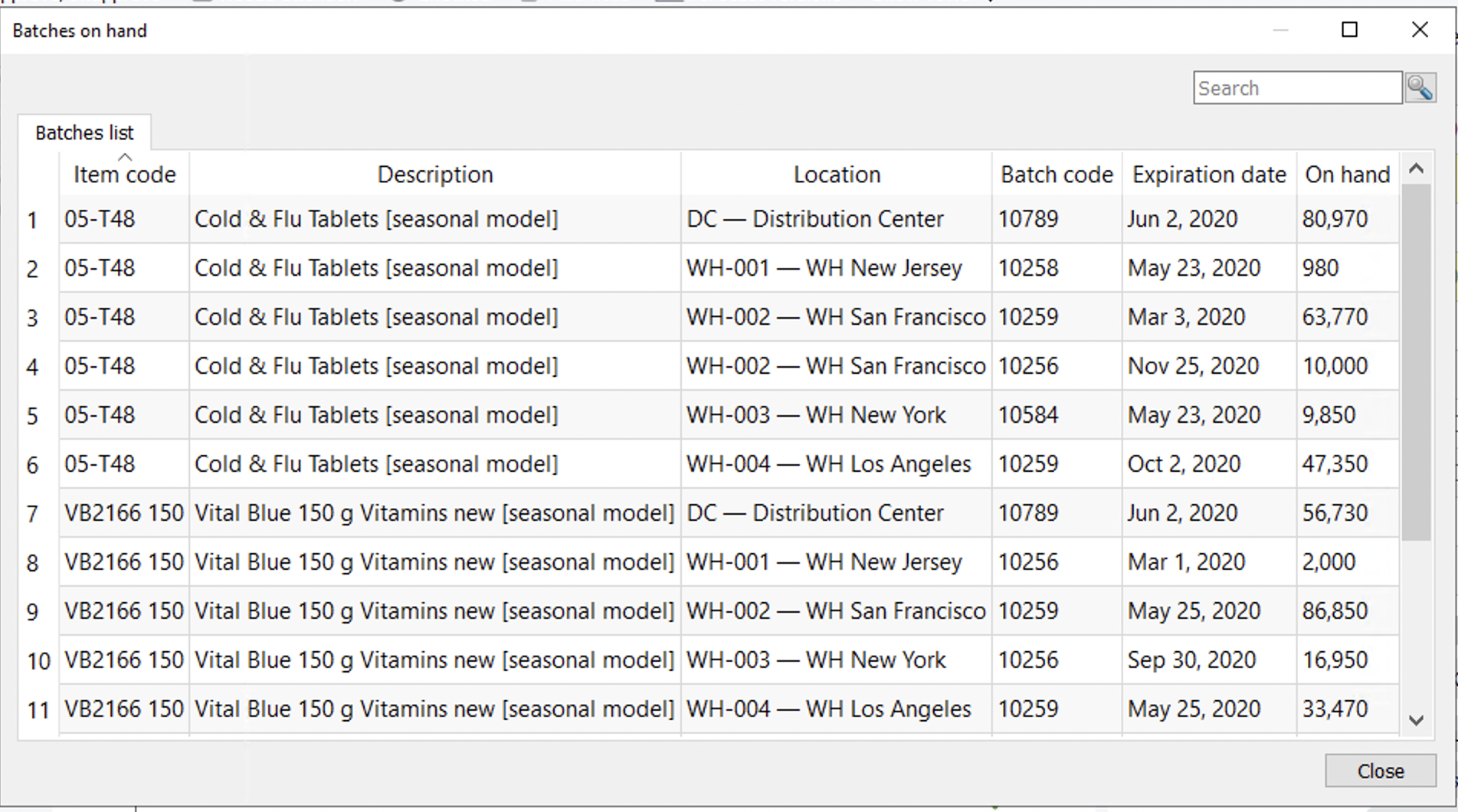 Item > Batches on hand command opens the Batches on hand dialog (see figure below). This dialog displays items and the corresponding batches information that are under the selected node in the Tree view.