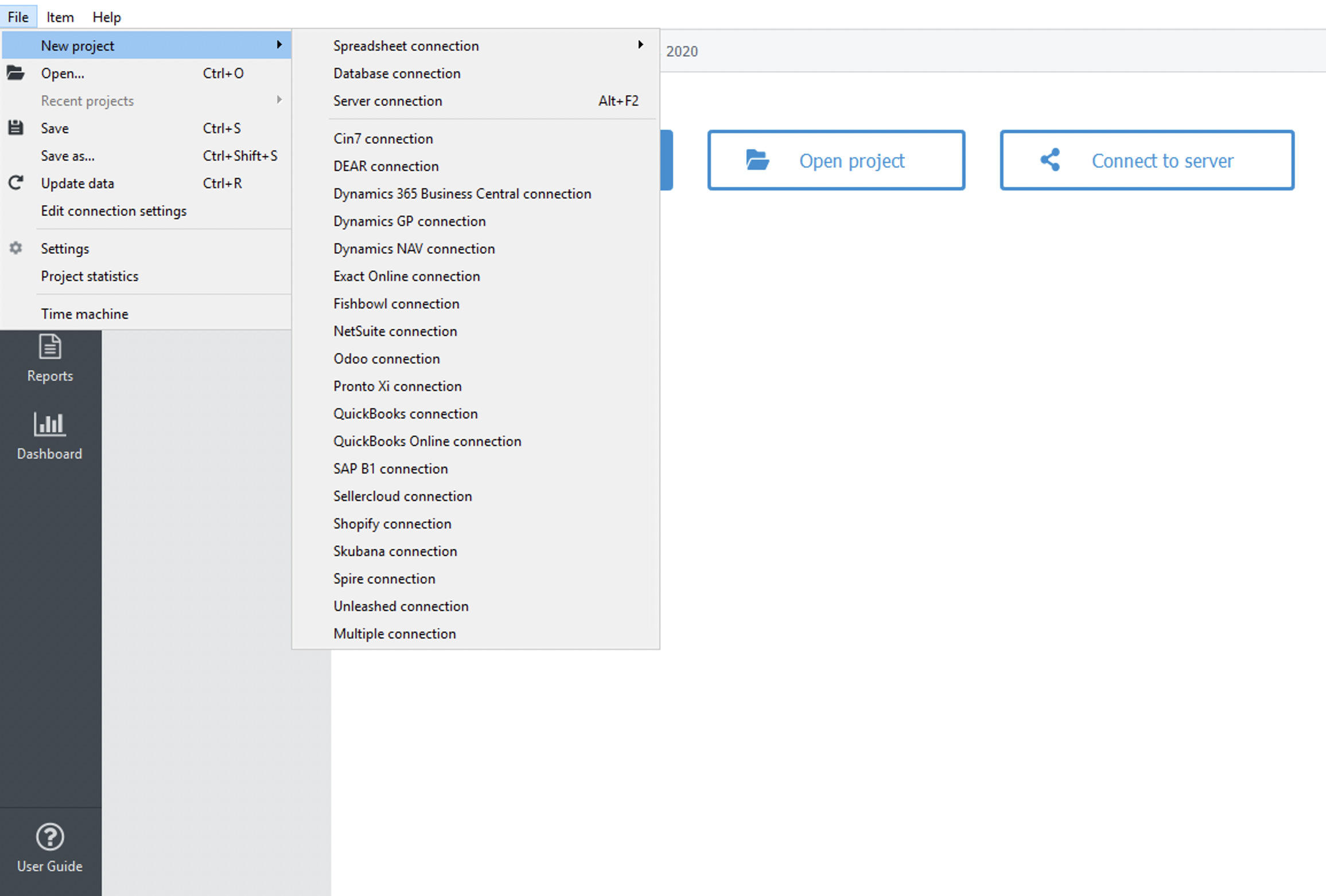 File > New > Sellercloud connection is used to create a new project from Sellercloud system.