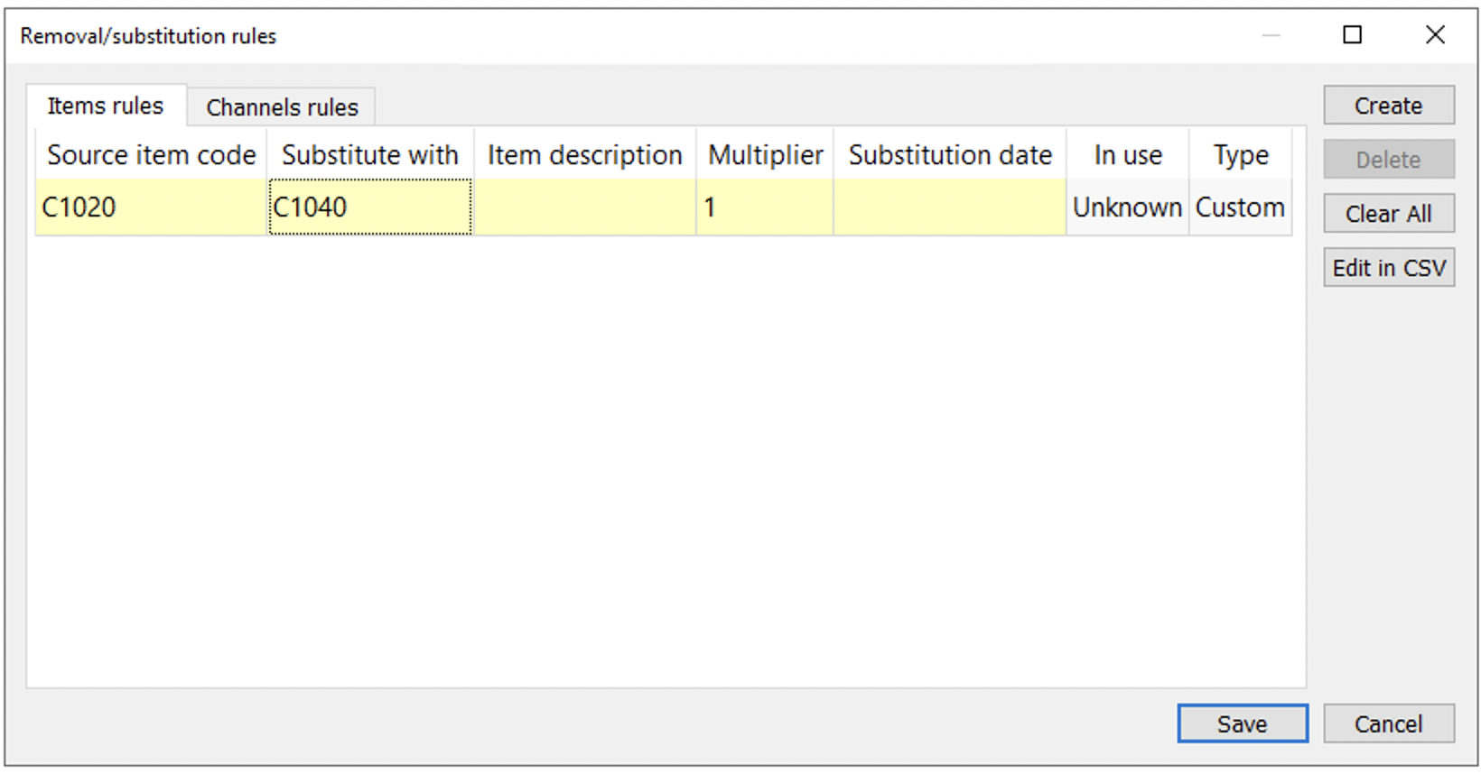 Item > Removal substitution rules… is used to manage item code removals and substitutions made in the current project. The command opens the Removal/substitution rules dialog.