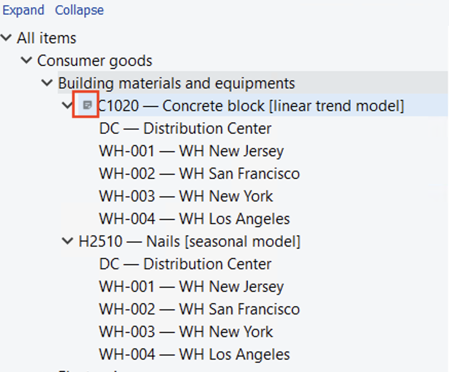 The title of the dialog contains the username specified in the General settings. If the name is empty, the name Anonymous is used. The icon is added to the items with notes in the Reports, Inventory, and Distribution Center. In the Tree view, such items are prefixed as shown below.