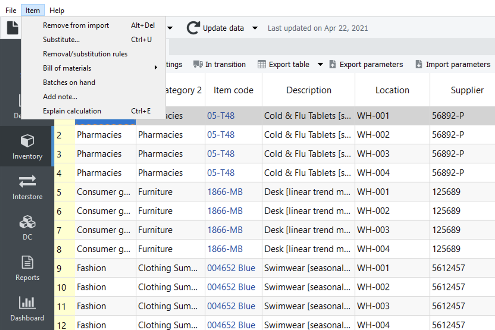 Item menu is used to manipulate items in the Tree View, Reports, Inventory planning, and Distribution center. The manipulations include removing item code from import, setting item substitutions, making item removals, adding/editing notes of the tree view leaf nodes, and explaining calculations.