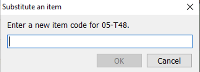 Item > Substitute makes a substitution for the currently selected item code by a new item code, entered by a user in the newly appeared Substitute an item dialog shown below. This command merges sales history and inventory information of the items and entitles the result with the item code typed in the dialog. If you enter an item code that is not in the project, the command will rename the source item code.
