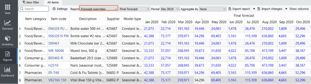 This report shows only your manual overrides to the statistical forecasts (see figure below). It is usually used to export only those to Excel.