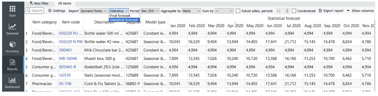 This report may be represented as a ‘Final forecast’, ‘Statistical forecast’, or Forecast version The Final forecast depicts the statistical forecast and any overrides for all the planning items, while in the Statistical forecast, overrides are not displayed.