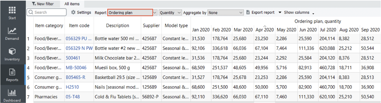 * The report may be represented in Quantity or Value. The ordering plan is default shown in quantities (the Quantity option). The Value option shows this report in the supplier's currency, accounting for the item purchase price.