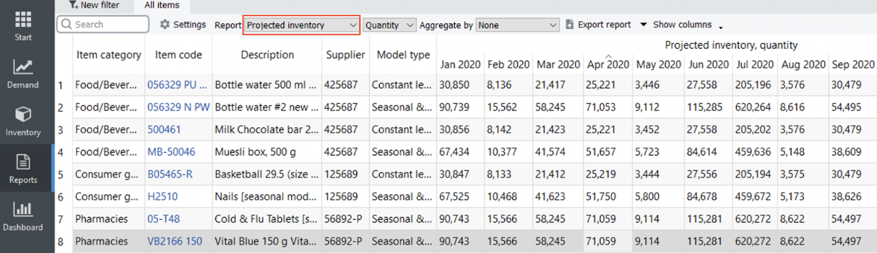 This report shows the projected inventory levels at the end of each period. The drop-down at the right of the Reports control sets the representation units for this report (see figure below). By default, levels are shown in quantities (the Quantity option is active). The Value option shows this report in the base currency, accounting for the item value.