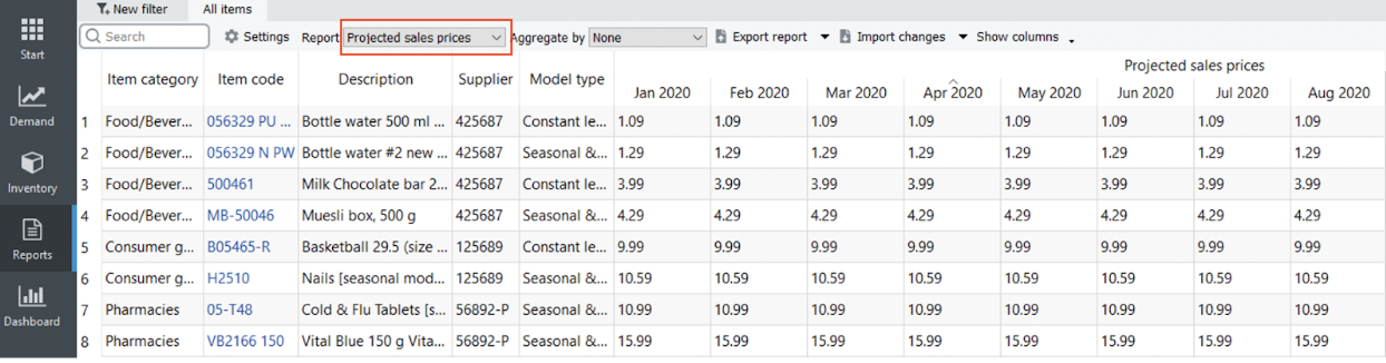 By default, this report propagates current sales prices into the future. If you have manual overrides to those, they are also included in this report. They are indicated with a blue color. If seasonal price forecasting is enabled, this report shows the generated sales price forecasts.