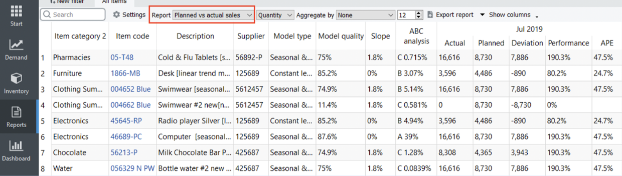 The report shows the measure of forecast performance based on the comparison between planned and actual sales.