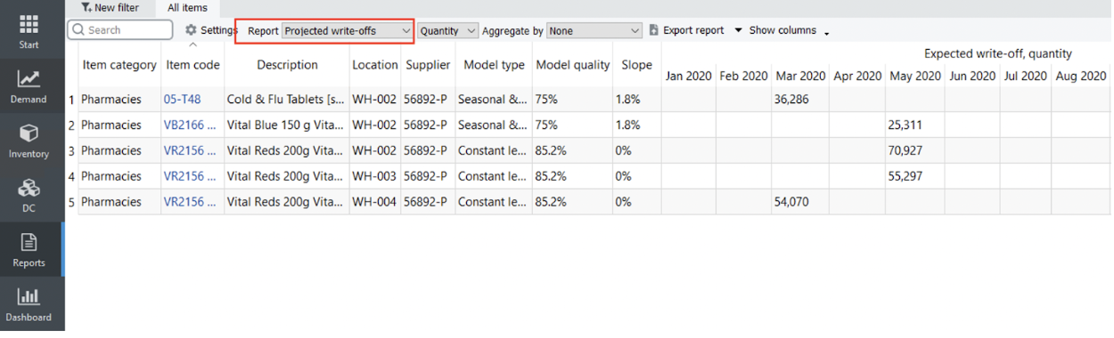 This report shows how many units will not be sold because of the lack of inventory in stock for each period. These are expected quantities determined based on the forecasts, current on-hand quantity, future deliveries and shipments, and expected write-offs (see figure below).