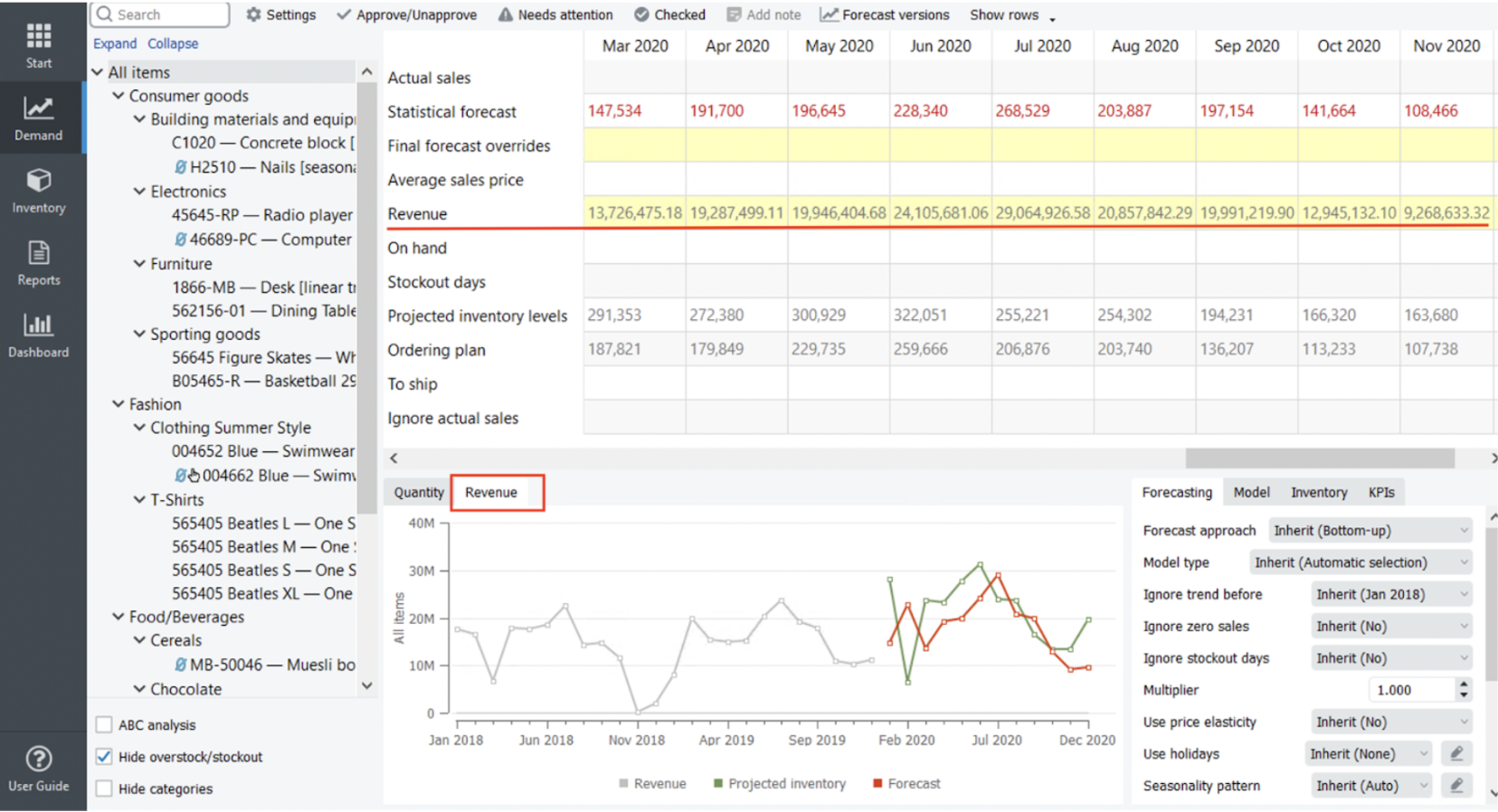 The revenue forecast can be viewed in the Table in the Item view and the Plot on Revenue tab.