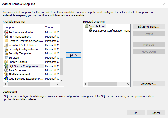 2. Go to menu File > Add/Remove Snap In…, select SQL Server Configuration Manager in the list on the left and click Add button. Then click OK. (see figure below).