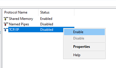 5. If TCP/IP Status is Disabled, right-click on the item, and select Enable command (see figure below).