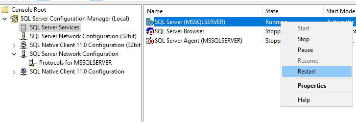 6. After that, select SQL Server Services node on the left, then, righ-click on the SQL Server (MSSQLSERVER) service on the right, and select Restart from the context menu (see figure below).