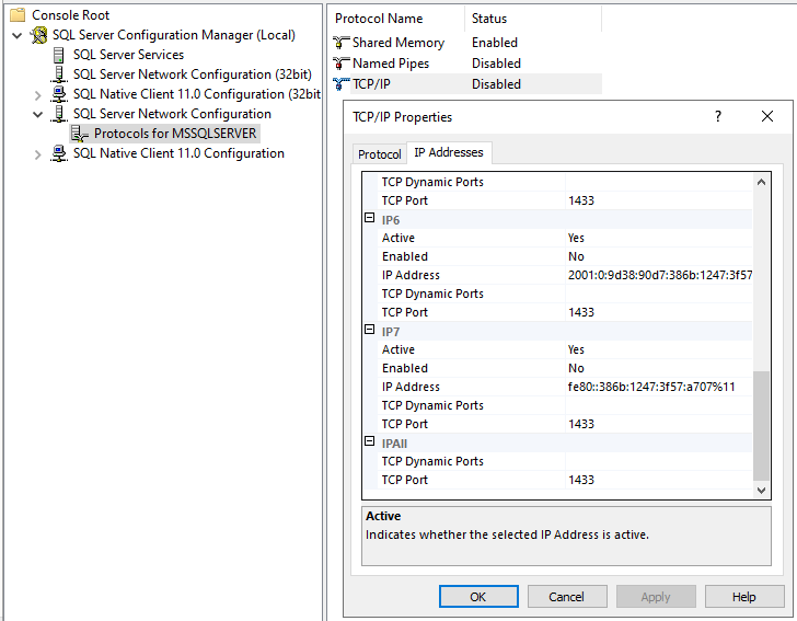 3. Expand the root node down to Protocols for MSSQLSERVER as shown in the figure below. Select it, then, right-click on the TCP/IP item in the list on the right, and select the Properties command from the context menu. Then, go to the IP Addresses tab of the dialog, and scroll it all the way down to the IP All section (see figure below).