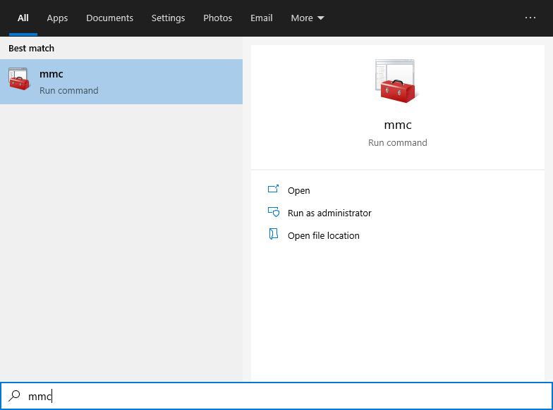 1. Go to Windows applications search, type in 'mmc' and hit Enter (see figure below).
