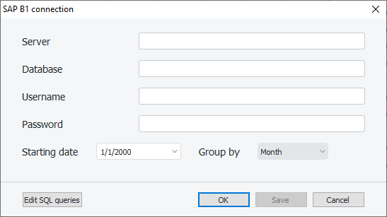 1. Go to the menu File > New > SAP B1 connection. The SAP B1 connection dialog appears (see figure below).
