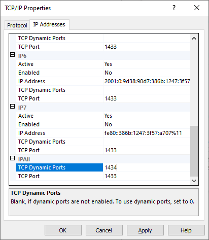 4. Set TCP Dymnamic Ports field to any free port, for example, 1434. This port will be used by Streamline to connect to the SAP B1 database (see figure below). TCP Port is used by SAP B1 SLD service to connect to SQL Server.