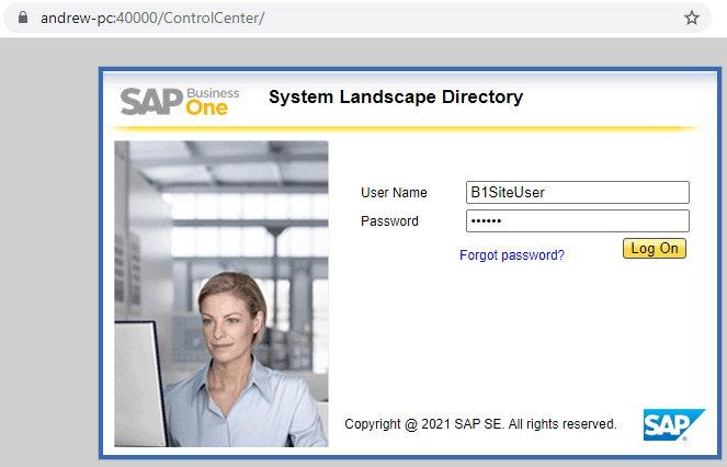 where <sap-server-name> is the LAN name of the machine runnning SAP B1 Server component, for example, https://andrew-pc:40000/ControlCenter/.