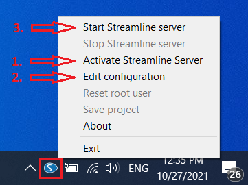 After you have activated Controller and set up the configuration, click on the Start Streamline Server. This option starts running the .gsl file and allows the user to connect to it in a multi-user mode. Next time you turn on your computer, the Server will be started automatically.