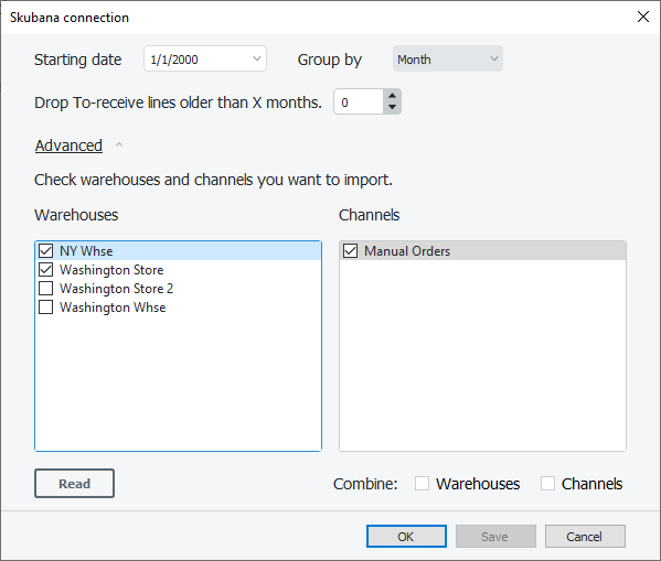 The Advanced button of the connection dialog shows some additional settings that allow you to select a particular set of warehouses and channels you want to import (see figure below). You can combine channels, warehouses, or both of them.