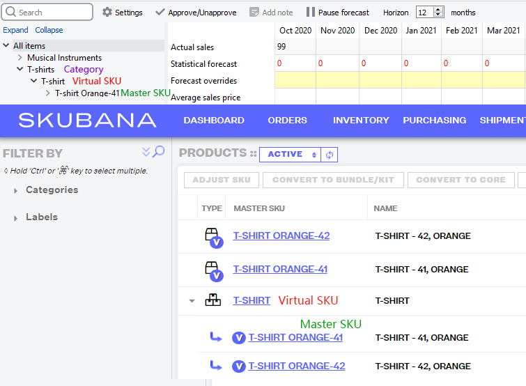 Virtual SKU is imported into Streamline as a category right above master SKU (see figure below).