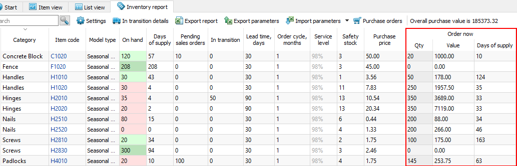 The Inventory planning tab shows current purchase recommendations for all of the items in the Order now section (see figure below).