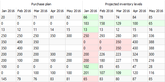 Let’s take a closer look at item H8010. The generated purchase plan and projected inventory levels for this item are shown by the Purchase plan and Projected inventory levels rows of the Table (see figure below).