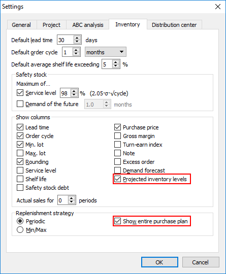 The Inventory planning tab can also show the purchase plan and projected inventory levels. To display them: