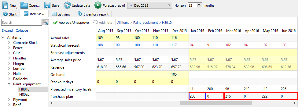 Remove this page from your book Streamline can show purchase plans and projected inventory levels on different bases. The Demand forecasting tab shows purchase plans and projected inventory levels on an item basis whereas the Inventory planning tab displays them for all of the planning items in one report.